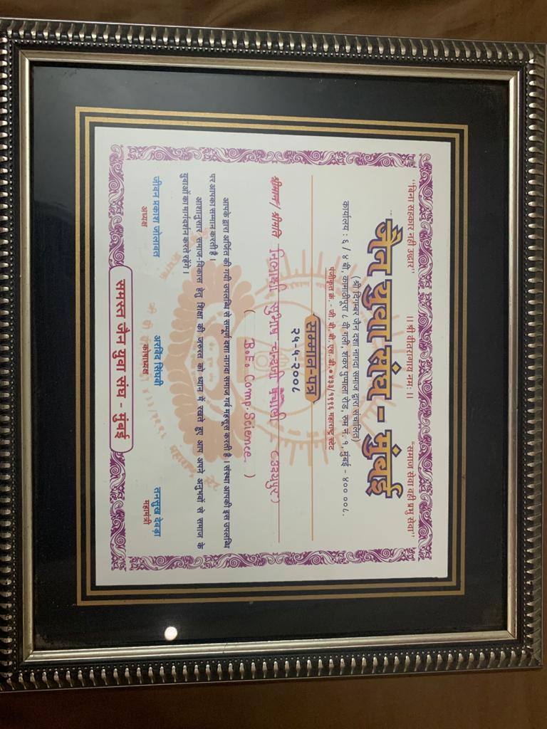 Received Samaj Gaurav Alankar Samman in January 2018 by Jain Yuva Parishad , Udaipur.
