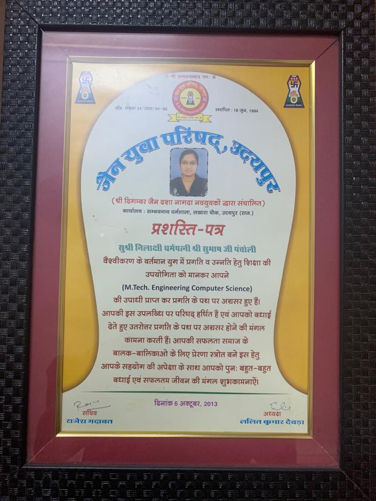 Received Education Award by Jain Yuva Parishad, Udaipur on 06th October 2013.