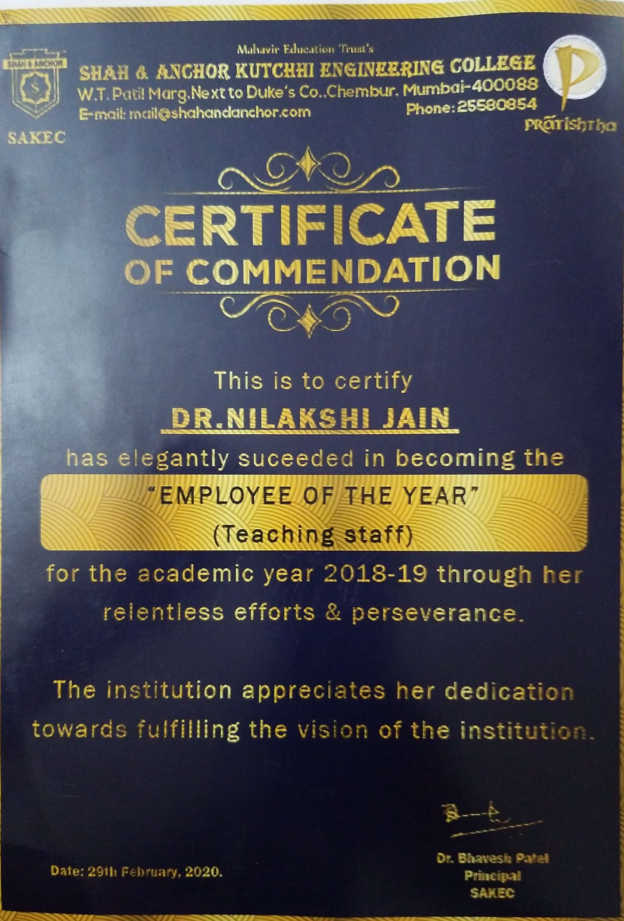 Awarded as “Best Employee of the Year” by Shah and anchor Kutchhi Engineering college for Academic Year 2018-19 on 29th February 2020.