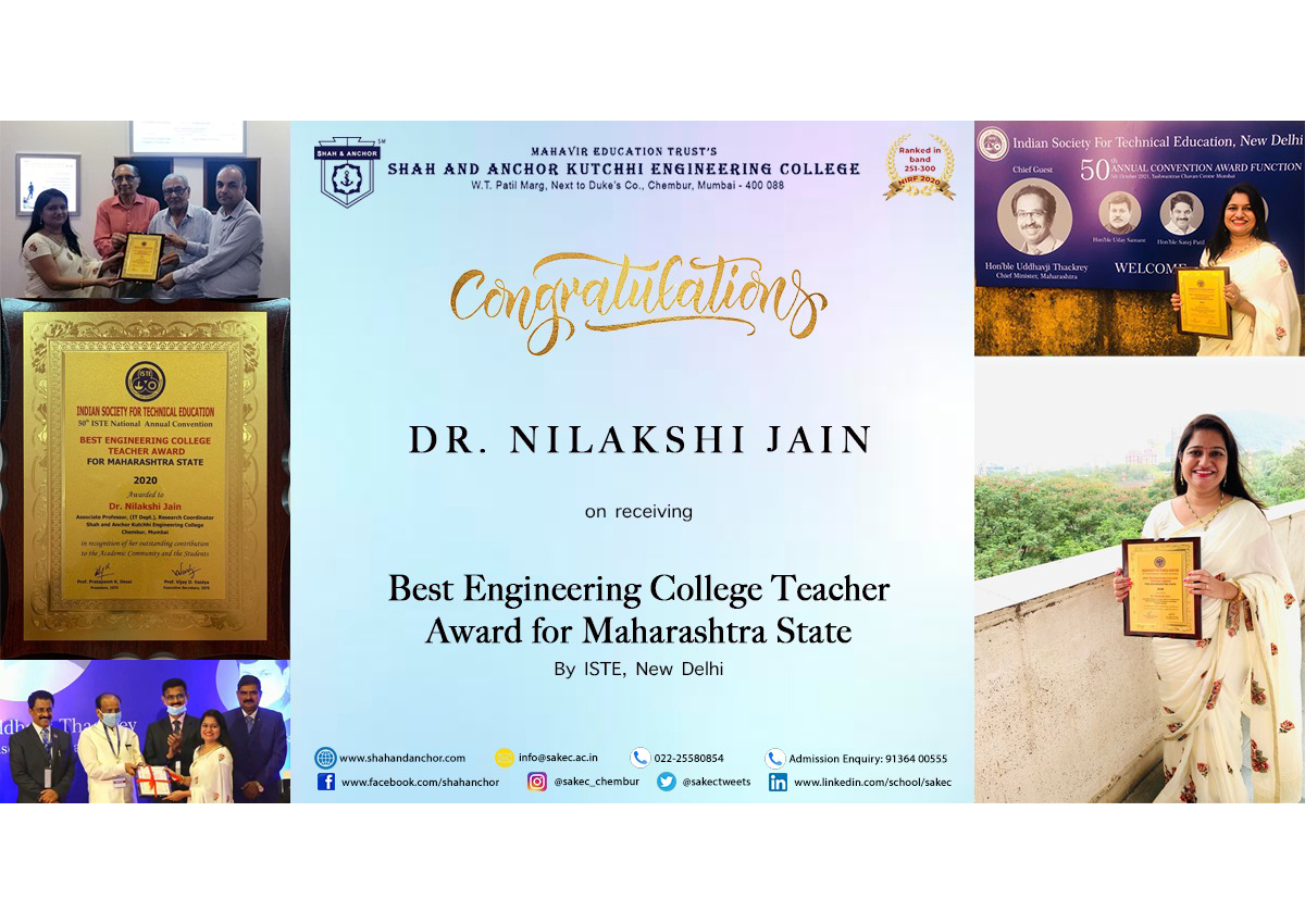 Awarded as Best Engineering College Teacher Award for Maharashtra State for the year 2020 by Indian Society for Technical Education (ISTE). ISTE 50th Annual Convention award function held at Y.B. Chavan Centre, Mumbai (Maharashtra) on 05-10-2021.